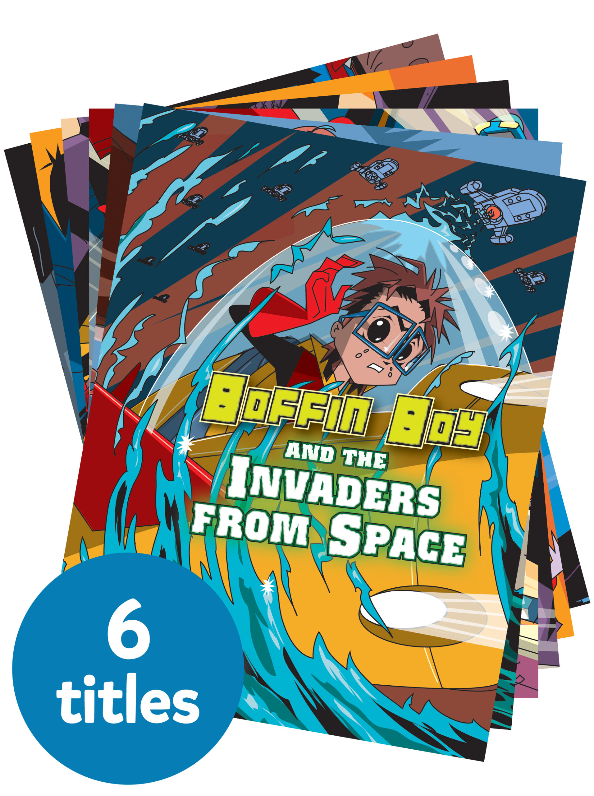 The first six books in Boffin Boy – our bestselling series of low-level graphic novels following the adventures of superhero Boffin Boy and his ninja wizard side-kick Wu Pee.