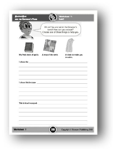 Support: Ensure that the students understand the task. Discuss with the students the value of each of the items suggested on the worksheet, with reference to the story. Note that the students are asked to imagine that they are part of the story and are taking part in the adventure. The students are asked to decide which of the items listed would be of greatest use and to justify their choice. They then need to write a paragraph, or a sentence if more appropriate, to explain how the item aided their escape.
