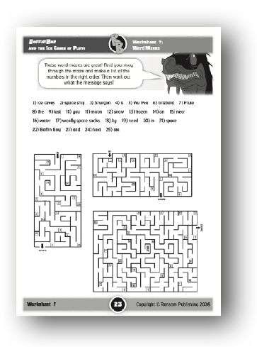 Support: Explain that the objective is to work through the maze, writing down the numbers in the correct order, as each number is reached. The key can then be used to create a sentence. Note: not all the words included in the key actually appear in the word mazes. (The completed sentences are: Grizbold is on Pluto in the Snurgon space ship. Boffin Boy and Wu Pee are lost in the ice caves. You need woolly space socks in the snow on Pluto.)