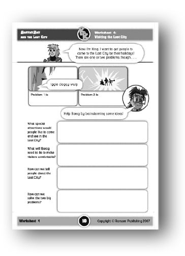 Support: Identify the two main problems for visitors: i) the language ii) the problem of getting there. Brainstorm answers to the questions posed on the worksheet. Note ideas on the sheet. Suggest ways in which the two main problems can be overcome e.g. using Snurgon technology to help people with the language problem, or Boffin Boy inventing a special gate from the Lost Valley to the Lost City.