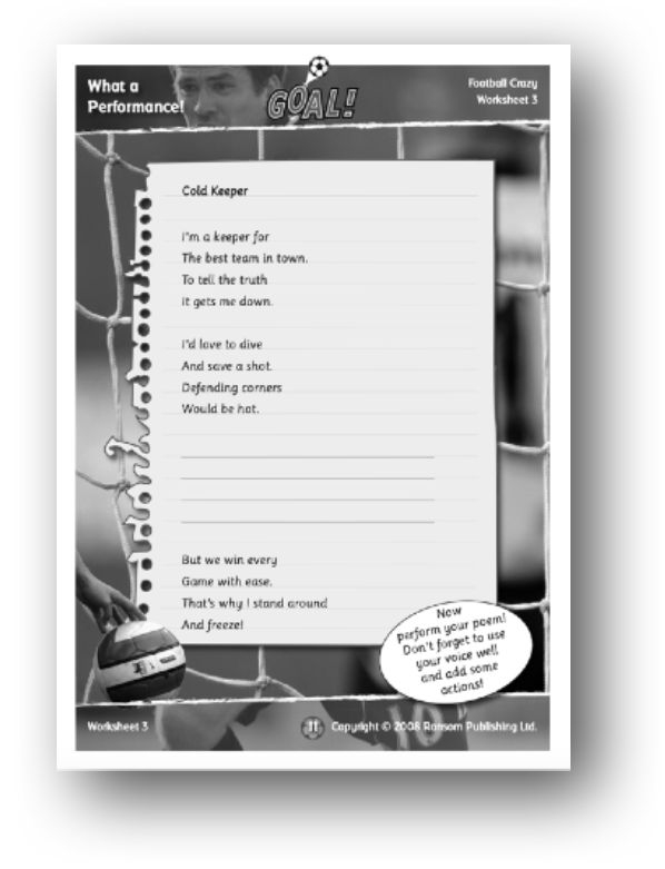 Activity: Remind the children about the poem Cold Keeper from the book. Re-read the poem together, focusing on the rhythm. Ask the children to tell you about the rhythm and rhyme in this poem. Working together, discuss other situations that could be written about in relation to the poem, such as having to face a penalty or having to punch a cross away. Show the children the worksheet and explain that they need to add a new third verse to the poem. Ask the children to use the ideas they have discussed to write a new verse for the poem. Point out that at this point in the poem the keeper is still talking about all the things he or she would like to do: the ‘joke’ (the fact that the team is so good that they win every game with ease) isn’t really revealed until the final verse.