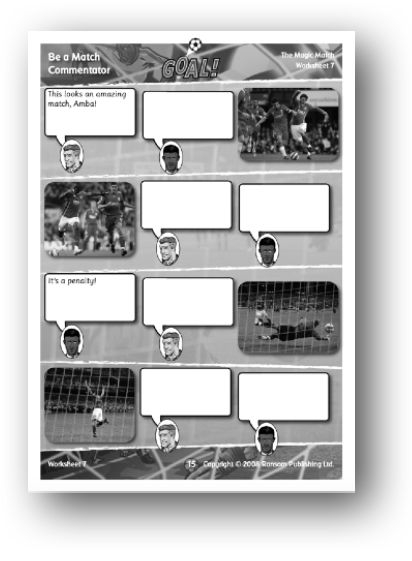 Activity: Remind the children about the context of The Magic Match. Discuss how football match commentators work for TV and radio broadcasters to describe the action on the pitch. Discuss how commentators often work. There is usually an ‘anchor man’ who provides most of the commentary, with a second commentator – often a football celebrity – who provides additional thoughts and comments. This person is often referred to as the ‘colour man’ because he makes the commentary more interesting (i.e. colourful). Talk about some of the clichés that commentators often use. Are there any examples in the book? Direct the children to look at the match photos on the worksheet and then discuss the incidents shown in each one. Ask the children to imagine they are the match commentator and to think of how they would describe the action. Now ask the children to write their match commentary and, when finished, to practise saying their commentary aloud. Again, remind the children about using the voice appropriately to build tension and grab the viewer’s/listener’s attention. Allow the children to perform their commentary to a group and, if possible, record it so that the children can listen to their voices.