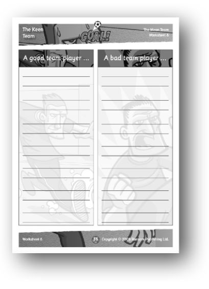 Activity: Ask the children to recount the story of The Mean Team. Ask them to reflect upon how Zak feels towards his team and his coaches in the book. Focus upon their lack of team work and how they play unfairly and argue all the time. Encourage the children to think about what makes a good team, and how teamwork and acting in a sporting way is more likely to achieve a positive result. Also discuss how teams that do not work together and play in an unfriendly manner often end up achieving nothing. Then give the children the worksheet and ask them to write their ideas on good and bad teamwork in the boxes provided. What kinds of behaviour make a good team? What are examples of bad team behaviour? When the children have completed the worksheet, ask them to share their ideas with the group.