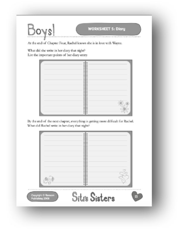 Support: The first writing frame is for notes relating to Rachel’s feelings at the end of Chapter Four. The second frame is for the notes on Rachel’s feelings at the end of Chapter Five. Discuss the conventions of diary writing. Note that diary writing is in the first person and is informal. Note that diaries are intended to be secret, so the writing can be very honest. Then recap the events in Chapter Five. Discuss how Rachel is feeling at the end of that chapter. How does Rachel feel about Donna? Make notes, in the second frame, for a diary entry commenting on Donna and Wayne at this point in the story.