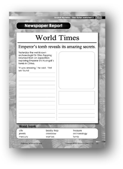 Support: The worksheet has a partially completed newspaper report on an exploration of the tomb of Shi Huangdi. Students are required to complete it. There is also a word bank of useful words. First it might be helpful to review how to write a newspaper report, perhaps looking on the internet for newspaper reports of archaeological discoveries. Students may pick up on some of the ideas mentioned in the reading book text, particularly on pages 16 and 17, but they could also draw on other sections and could supplement these ideas with further information from the internet. This research could be used to extend the word bank on the worksheet. Students can then complete their report. Point out that, whatever happens, Sir Giles has to survive, given the way the report begins!