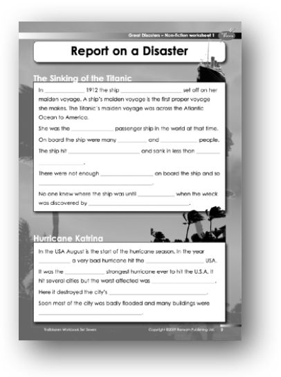 Support: The worksheet consists of two cloze activities giving details of the Titanic sinking and the disaster of Hurricane Katrina. Some additional information is included, but the most appropriate words for filling in the spaces can be found in the text of the reading book. Ensure that the students understand the significance of a ship’s maiden voyage. They should also appreciate that hurricanes are always given a name, by weathermen, when they are identified as such. Work through the texts orally before asking students to complete the worksheet.