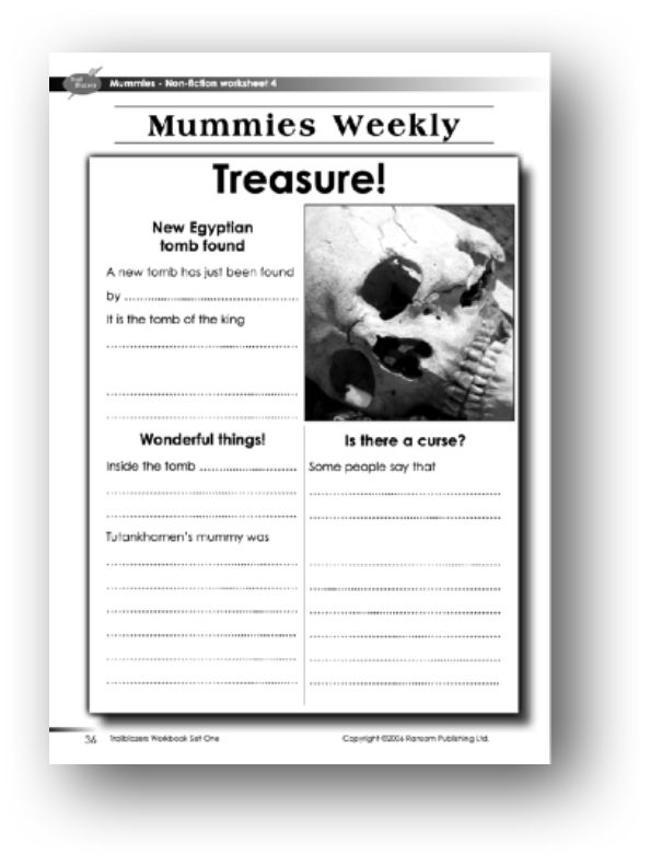 Support: Read Chapters 3, 4 and 5 of the non-fiction section of the book (‘How are mummies made?’, ‘Treasure’ and ‘The mummy’s curse’). Use the information in these chapters to compile a newspaper page. The sub-headings on the worksheet indicate the topics for each section, and a starter has been given. Pupils should be encouraged to finish off the sentence in each case, but should also try to add some further information appropriate to each section.