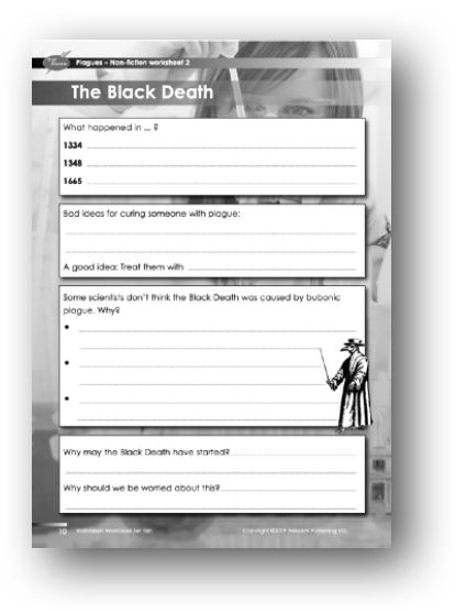 Support: Students are required i) to identify events that happened on three specific dates; ii) to discuss cures; iii) to write a short statement on alternative theories about what actually caused the plague; and iv) to write about why it started. The first two questions can be answered relatively easily by referring to pages 10 and 11 of the reading book. The third question, on alternative theories of the cause of the Black Death, is a more challenging activity. Work with the group to pick out key points from the reading book text on page 11. The key points are: the description of the disease does not match what we know about it now; in some places where the disease struck there were no rats; they think it was caused by a virus, not a bacteria. The final two questions on the worksheet refer to the climate change theory, which is mentioned on page 10 of the reading book.