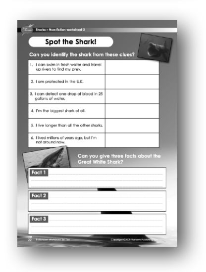 Support: The worksheet presents a table of facts about six different sharks. Students are required to identify the type of shark from the clue given and write the name of the shark in the second column. The correct answers are: 1. Bull Shark. 2. Basking Shark. 3. Great White Shark. 4. Whale Shark. 5. Spiny Dogfish. 6. Megalodon. Students are also asked to give three facts about the Great White Shark. If necessary, provide reading book page references for the students.