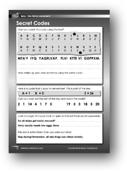 Support: The worksheet gives students a variety of codes to crack, and one message to encode. The codes are based on the text on page 12 of the ‘Spies’ reading book. The first code is a simple letter substitution code – locate the message letter on the second line, and replace it with the corresponding letter from the first line. The coded sentence reads: DON’T SAY ANYTHING. THIS ROOM IS BUGGED. The second code is a simple alpha-numeric code. Students should soon grasp the basis of this, and will be able to use it to write their own coded words and sentences. Writing out a column of letters with the appropriate numbers alongside will be helpful. The two words in code are: BANDAGE and SECRET. The code at the bottom of the worksheet uses the first letter of each word, as described at the bottom of page 12 of the ‘Spies’ reading book. The two secret passwords are: DANGER and HUNTED. The final sentence reads SDRAWKCAB – which is backwards – spelt backwards! Students might need a hint here.
