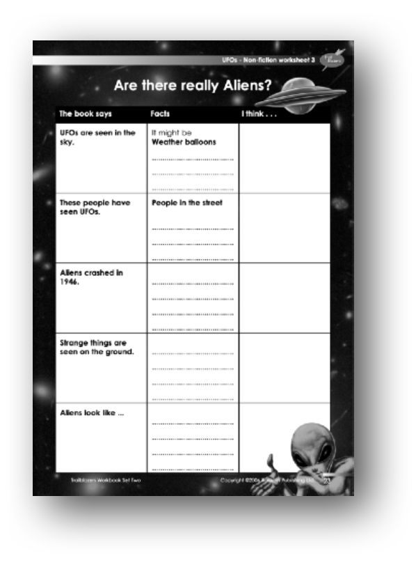 Support: Each row of the table on the worksheet relates to a different chapter in the non-fiction section of the book. Read the statement in the first box. Identify what the appropriate chapter says in support of the statement. List the evidence. Then in the final box write a personal opinion. This is a more challenging exercise and it might be more appropriate to complete it as a group task.