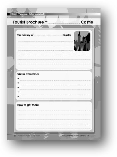 Support: Explain to students that the castle in the story ‘Blood In My Eyes’ has now become a tourist attraction, and that they are going to use the worksheet to design a travel brochure that will tempt people to go there. Discuss each section of the brochure, as outlined on the worksheet, and write notes on the board. Then ask the students to complete their own version of the brochure. Students should use their imagination to expand on the points given in the story. The first box should contain information on the castle’s history, including some of the events of the story. How can this be summed up in a paragraph? Students will also need to think of a name for the castle. The second box is for visitor attractions, e.g. refreshments, a museum, perhaps a gift shop. The final box shows practical information. How might visitors reach the castle from the local village? Might the castle provide a tourist bus service, for example?