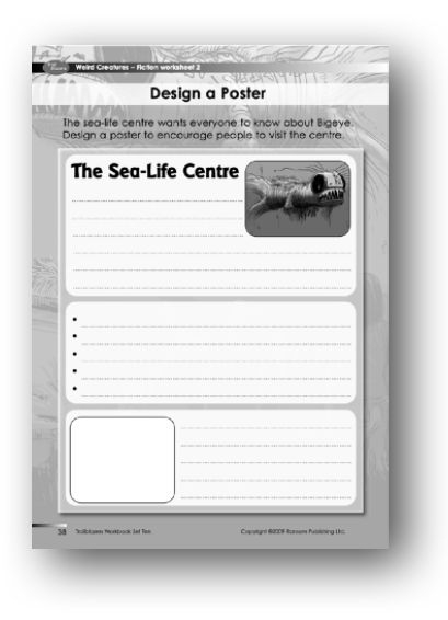 Support: The worksheet shows a blank poster for the sea-life centre featured in the story. Students are required to write and design the poster. First, discuss with the class the reasons why Bigeye would be of interest to the public. On the board, list useful words to help students write a brief description of Bigeye that would encourage people to visit the sea-life centre. Also discuss the sorts of words and phrases that are generally used to persuade people to visit attractions, and list these. Students can then design their posters. The poster could also be produced as an ICT activity.
